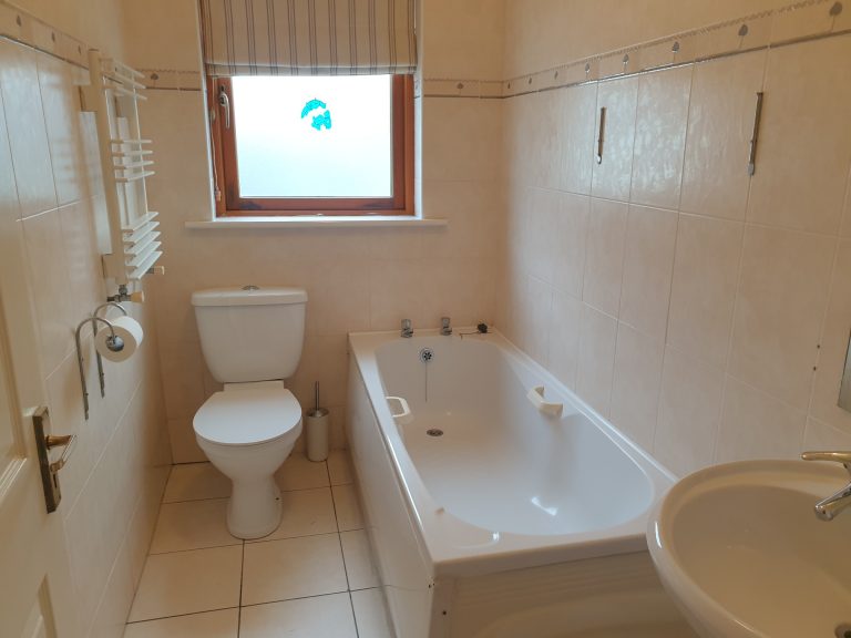 Bathroom 2.74m x 1.52m (9.00ft x 5.00ft) Tiled floor to ceiling. Three piece suite and heated towel rail.