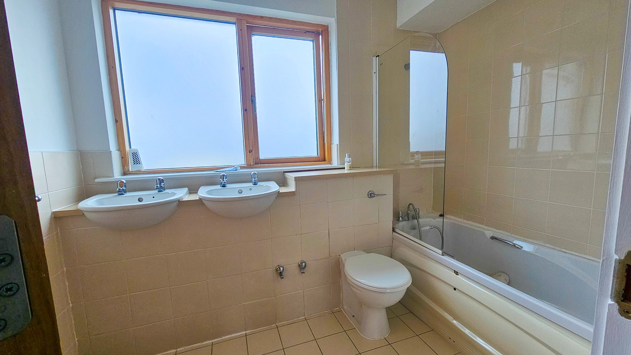 Partially tiled wall, 4-piece suite (2 sinks, electric shower with shower attachment), radiator