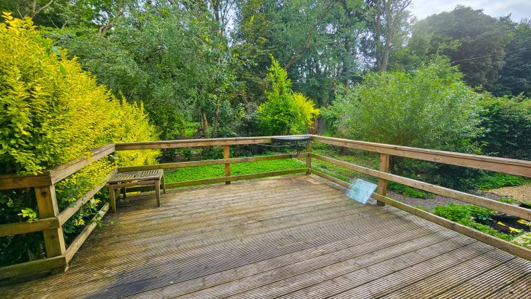 Rear garden with decking, lawn, mature trees and shrubs — perfect for creating your own private outdoor haven for family entertainment