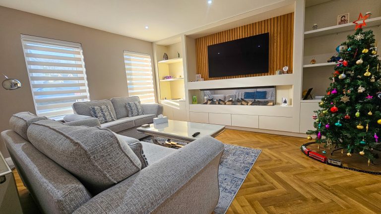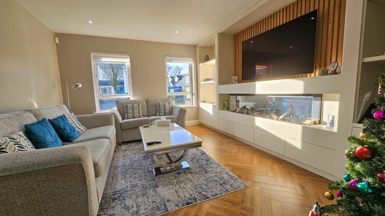 Timber flooring. Electric fireplace, inset lighting and wall-to-wall fitted units.