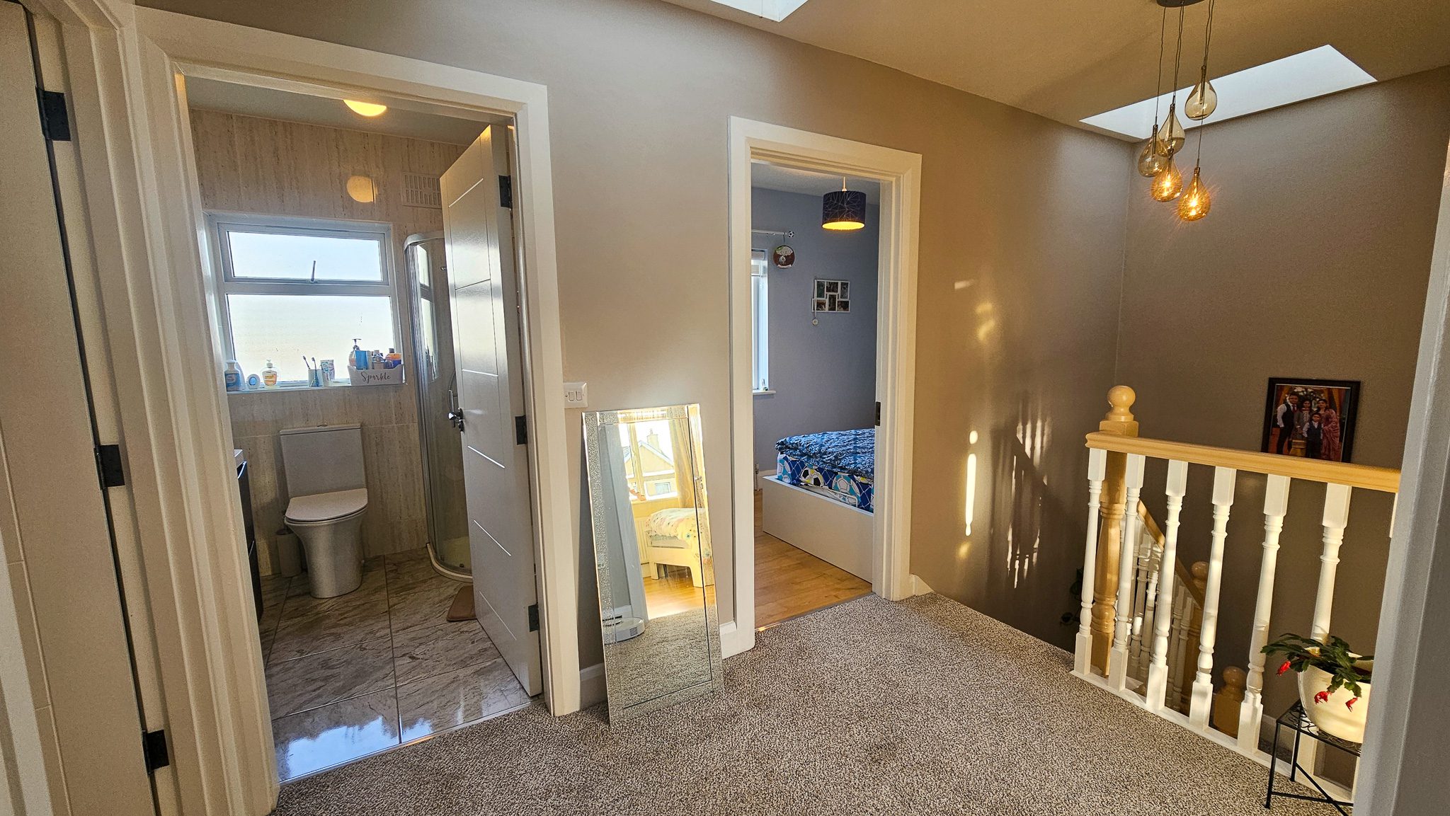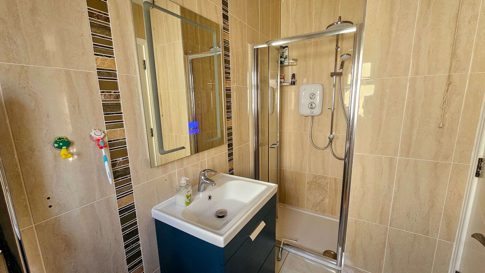 Fully tiled from floor to ceiling. Three-piece suite with corner electric shower.