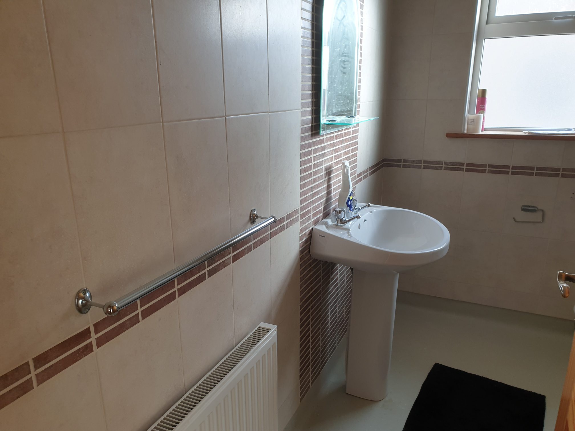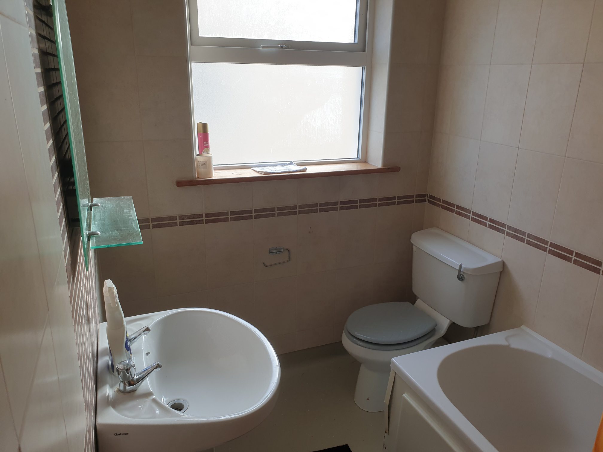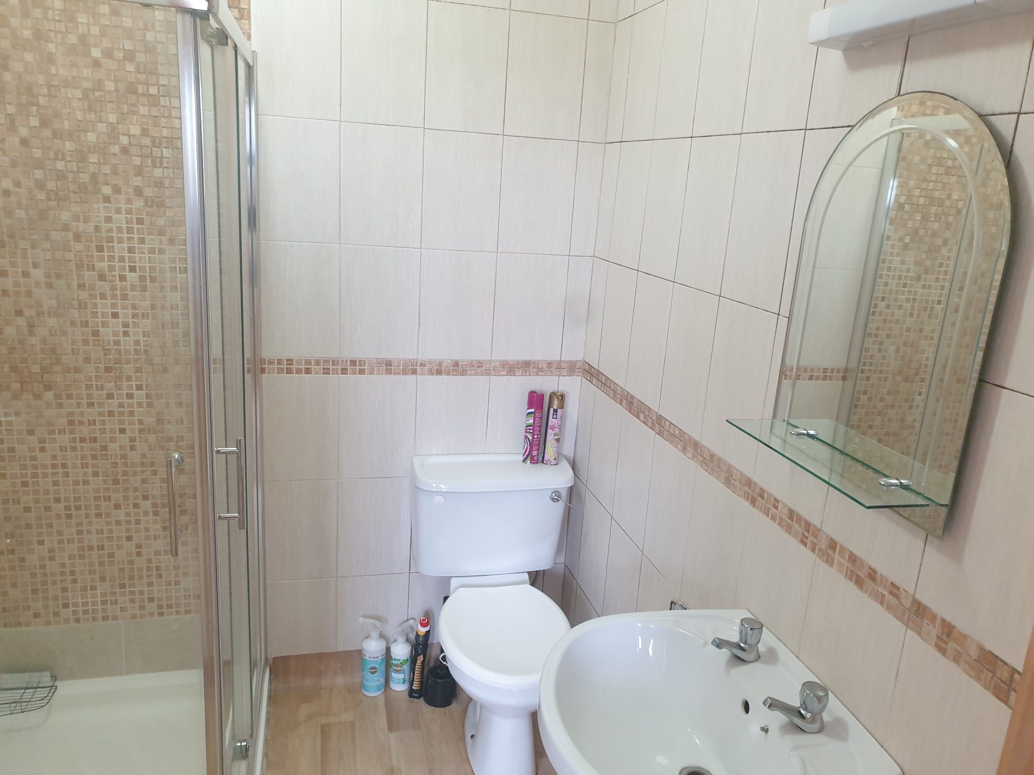 Vinyl flooring. Fully tiled walls. Four-piece suite with power shower.