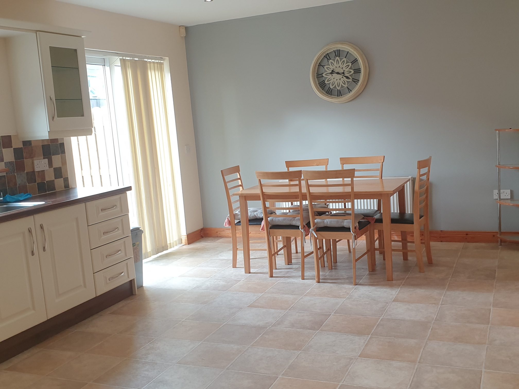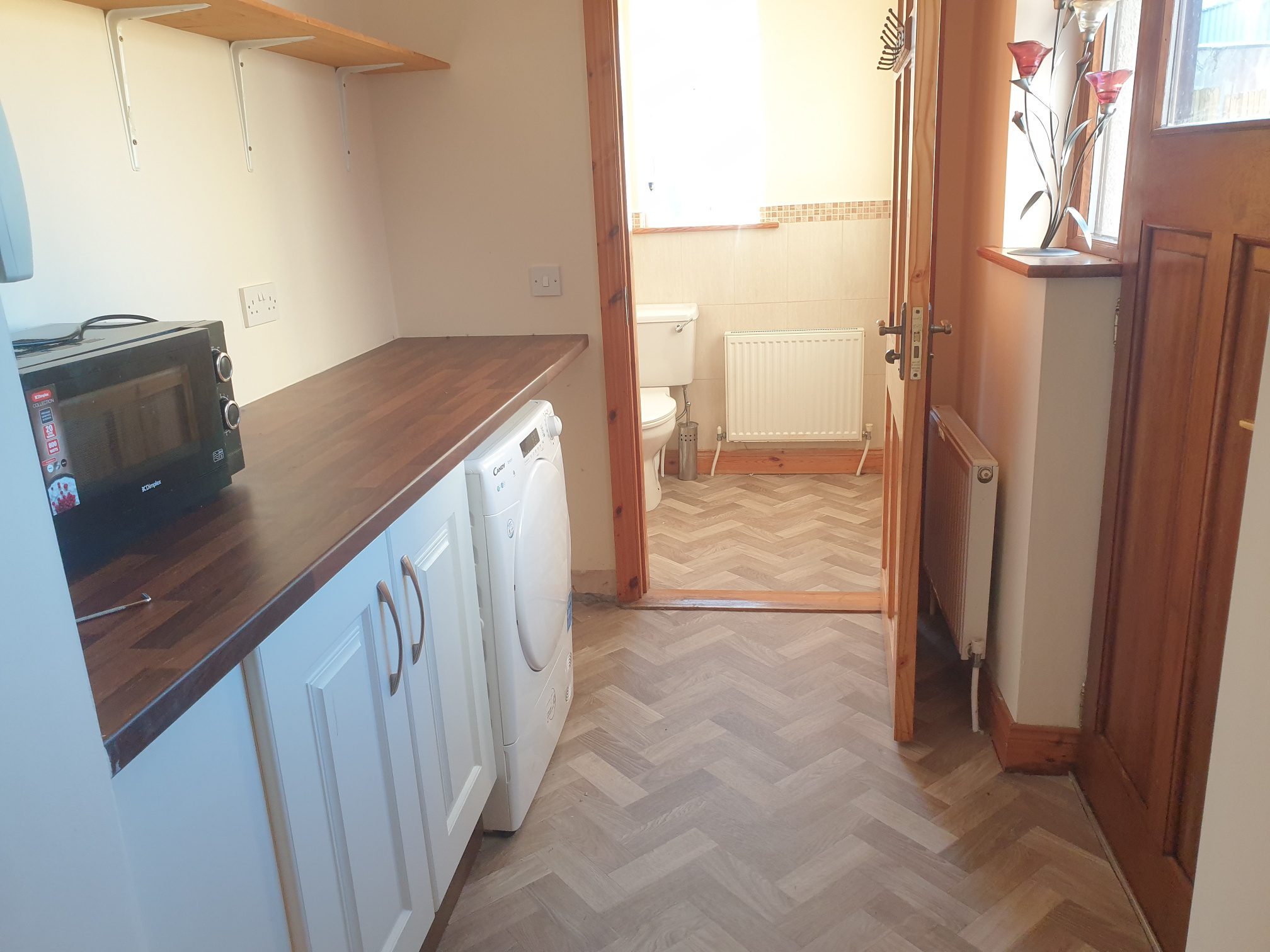 Vinyl flooring. Fitted units. Plumbed for washer and dryer. Guest WC and whb. Door to rear garden.
