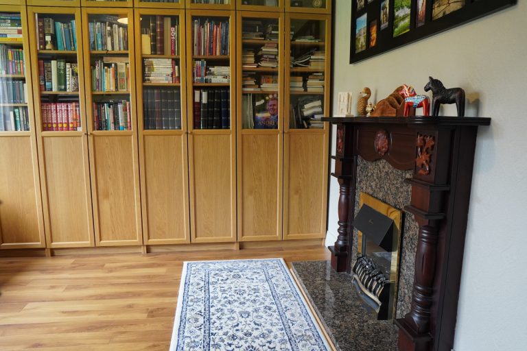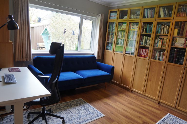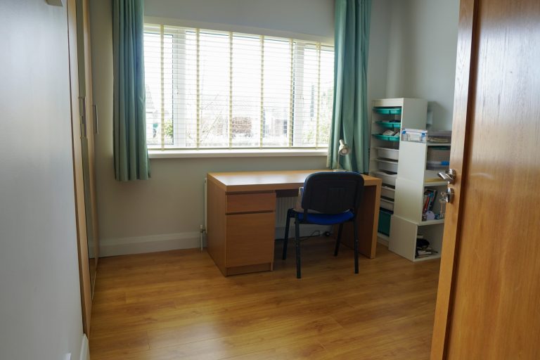 Office 4.15m x 3.66m (13.60ft x 12.00ft) Laminate floor. Fitted book shelving.