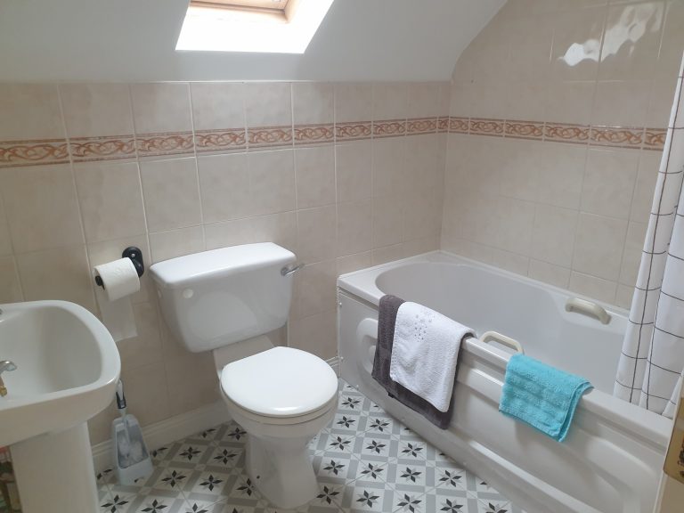 Bathroom 2.44m x 2.13m (8.00ft x 7.00ft) Tiled floor to ceiling. Electric shower and Bath.