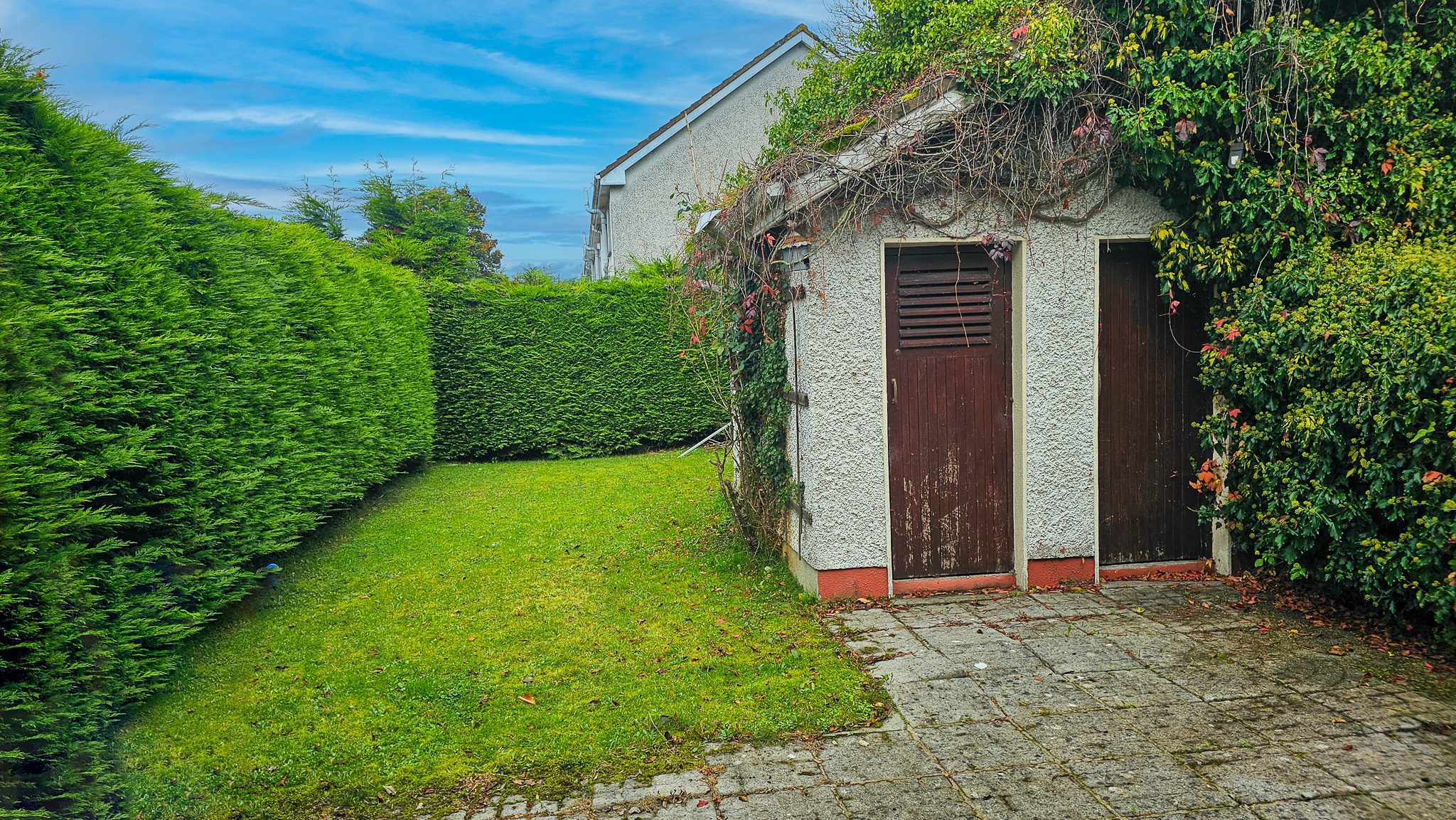 Additional features include a hot-press, stira stairs leading to a partially floored attic, and a fully serviced 11ft x 10ft garage to the rear, complete with sink, washing machine, and dryer. The large private garden with laurel hedging and a paved area provides an ideal family space.