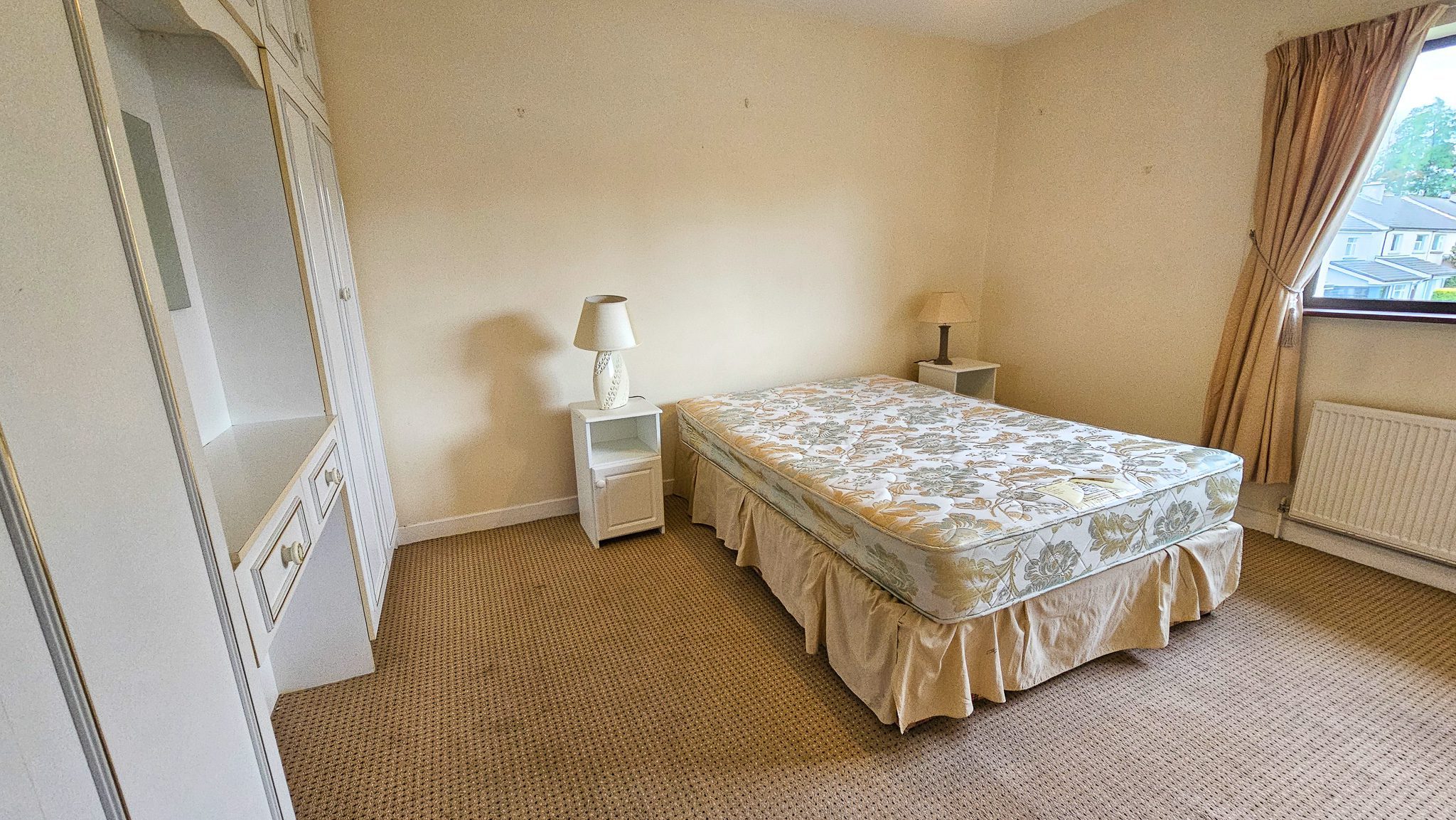 Carpet flooring, free-standing wardrobe, radiator.
