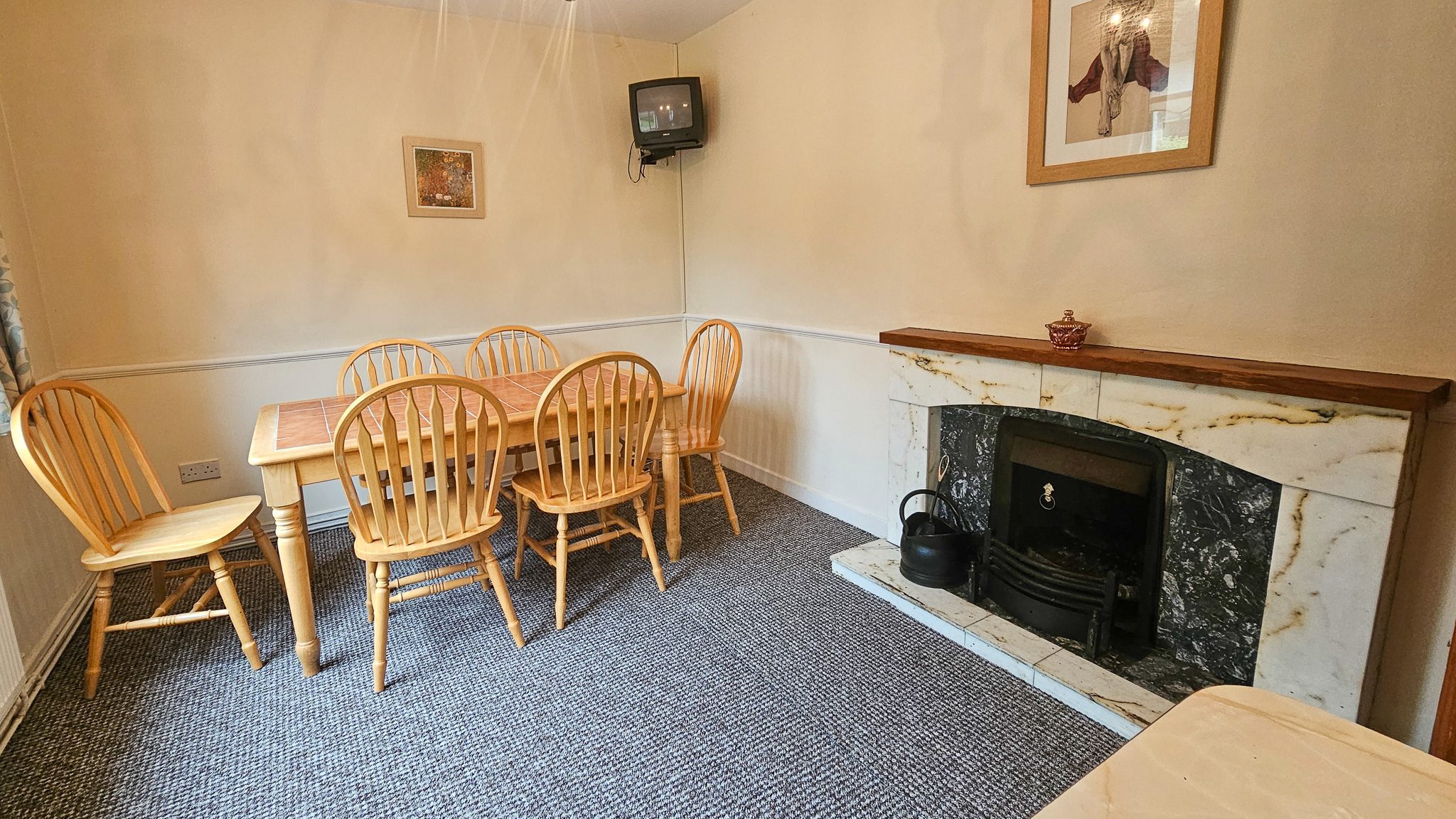 Tiled and carpet flooring, solid kitchen units, dishwasher, breakfast counter, open fireplace with marble surround and back boiler.