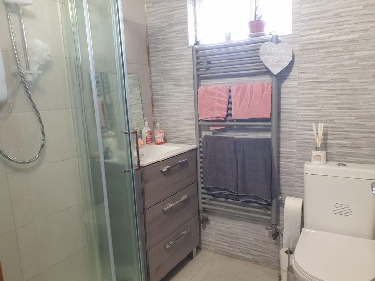Bathroom 2.44m x 1.83m (8.00ft x 6.00ft) Tiled floor and tiled walls with 3 piece suite. Electric shower and heated towel rail.