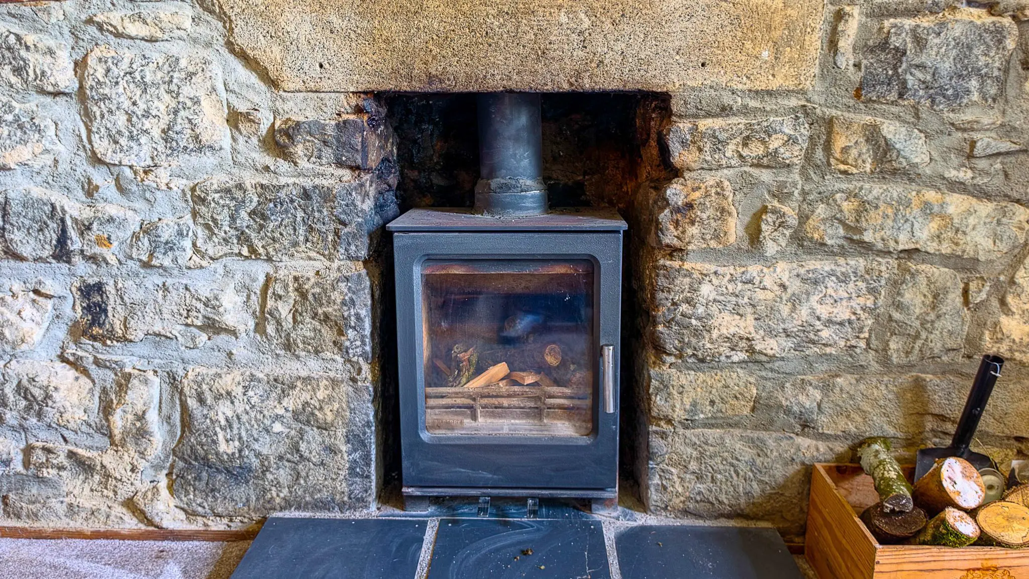 Cut-stone fireplace with solid fuel stove