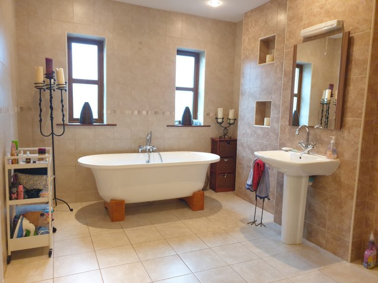 Downstairs Bathroom 4.27m x 3.05m (14.00ft x 10.00ft) Tiled floor to ceiling. 3 piece suite with feature bath.