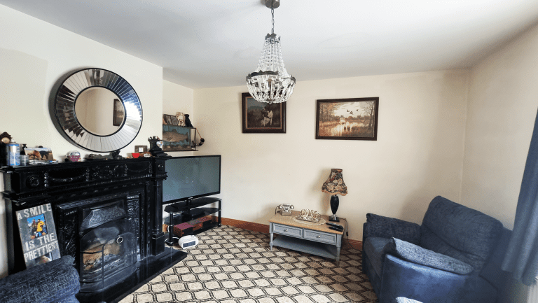 Carpet flooring, solid wood surround fireplace, feature centrepiece.